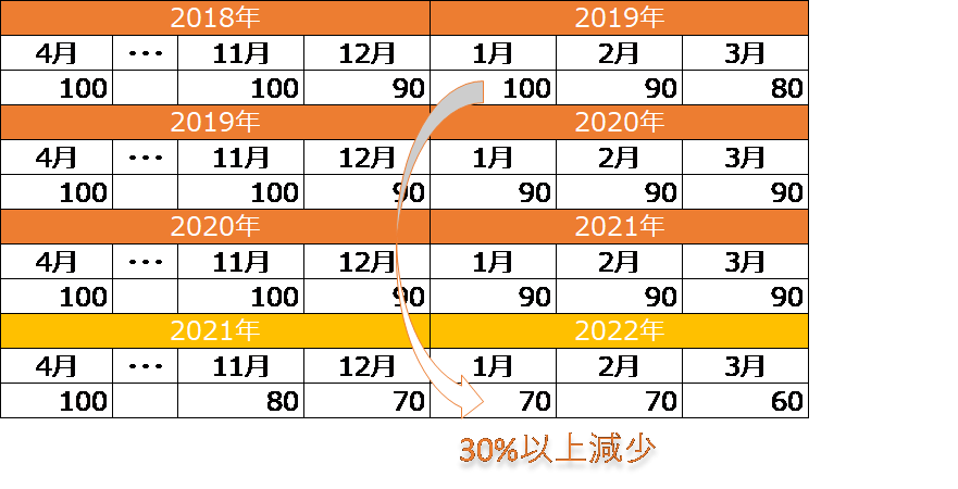新型コロナウイルスの影響により2021年11月~2022年3月のいずれか月(対象月)の売上高が、2018年11月~2021年3月までの間の任意の同じ月(基準月)の売上高と比較して50%以上または30%以上50%未満減少