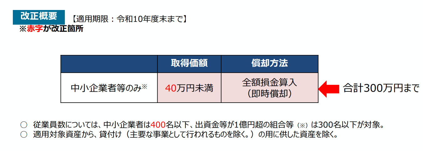 中小企業者等の少額減価償却資産の取得価額の損金算入特例について、対象となる減価償却資産の取得価額が30万円未満から40万円未満に引き上げられます(所得税も同様)。