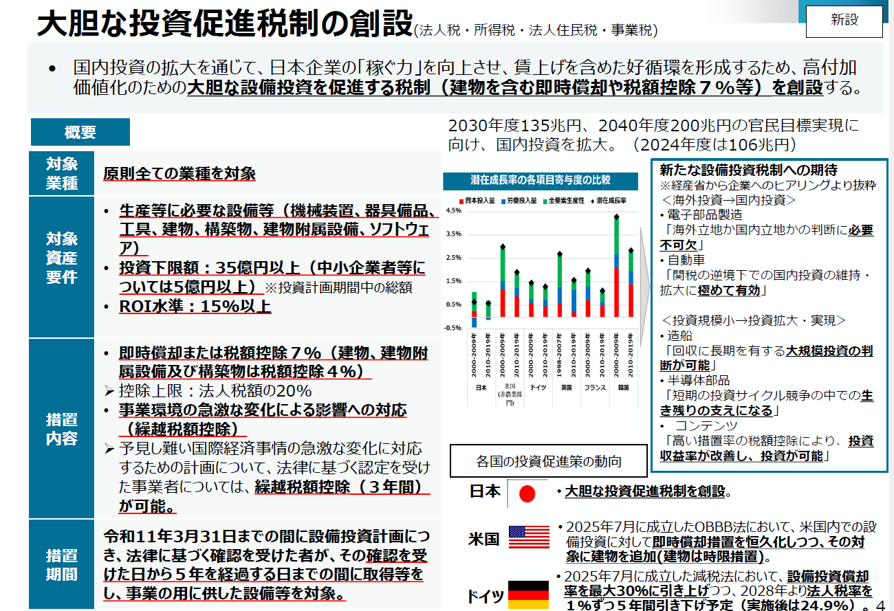 即時償却(100%減価償却)又は取得価額の7%税額控除(建物・建物付属設備・構築物については4%)。なお税額控除は法人税額の20%上限、控除できなかった減税額は3年間繰越控除可能