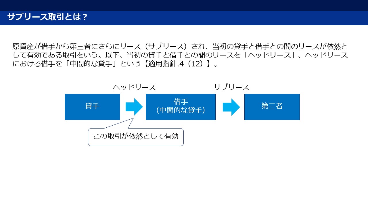 サブリース取引については、ヘッドリースとサブリースの契約は一般的に別個に交渉されており、当初の借手(中間的な貸手)にとってヘッドリースから生じる義務は、一般的にサブリースの契約条件によって消滅することはないと考えられることから、原則として、ヘッドリースとサブリースを 2 つの別個の契約として(ヘッドリースの)借手と(サブリースの)貸手の両方の会計処理を行うこととされています【適用指針.89及びBC124】。