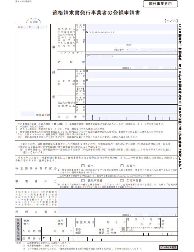 以下「国外事業者」向けの申請書サンプルを国税庁HPより貼り付けます。実際の申請はこちらを参照ください。